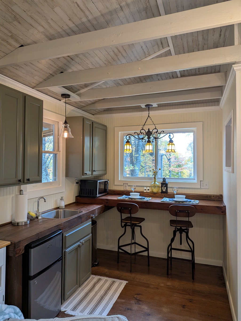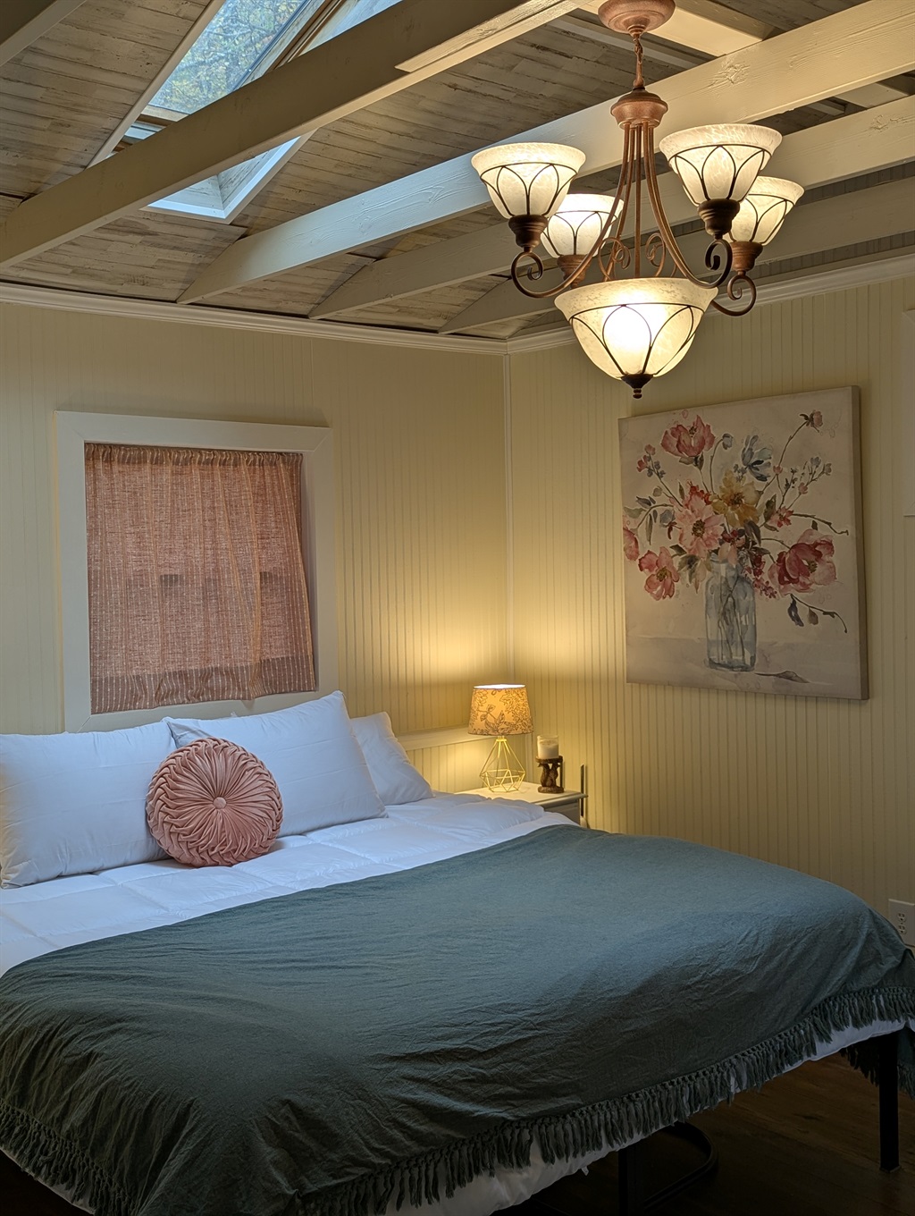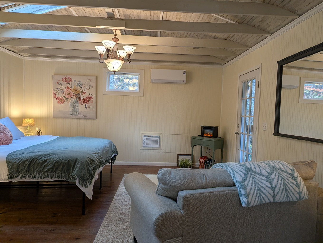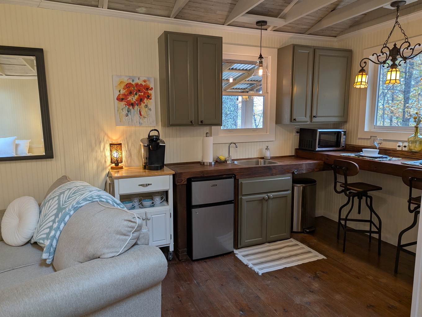 This cozy one bedroom has everything you need. A plush King sized bed, a private seating area and dining table. You have a private bathroom in your cabin with a clawfoot tub/shower, plush cotton towels are provided. Off the back of your cabin is a private porch with seating and table for two for you to take in the wooded views and sounds of the babbling seasonal stream.