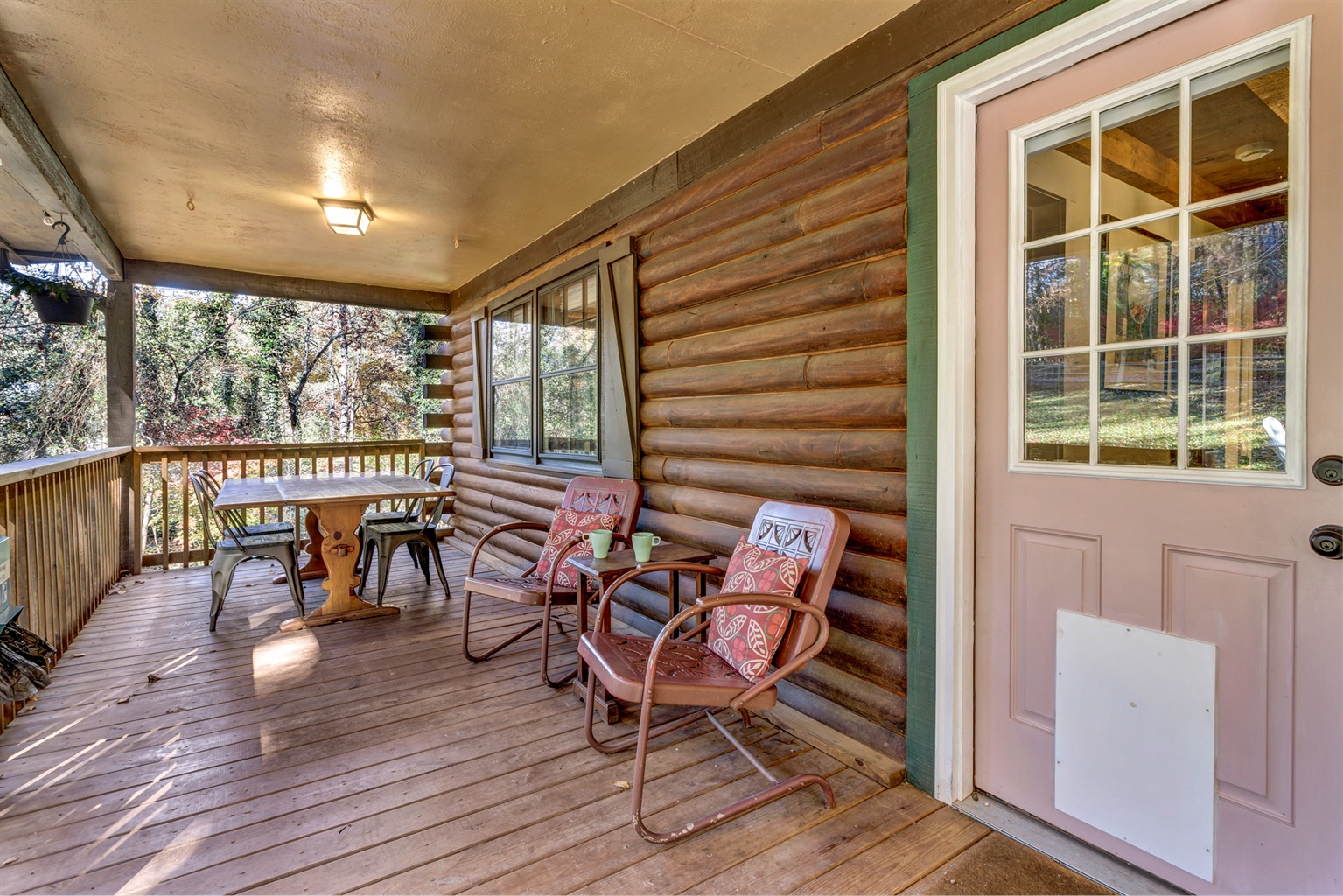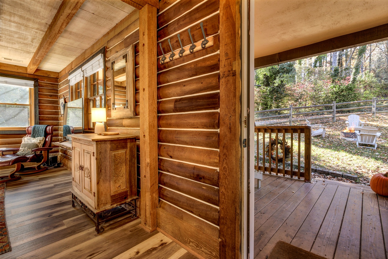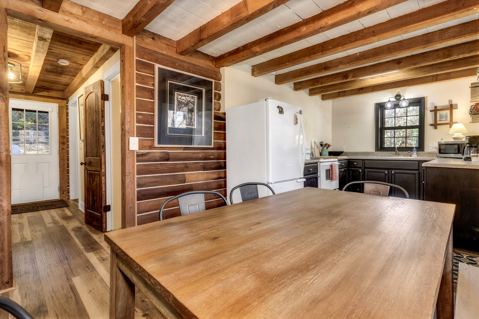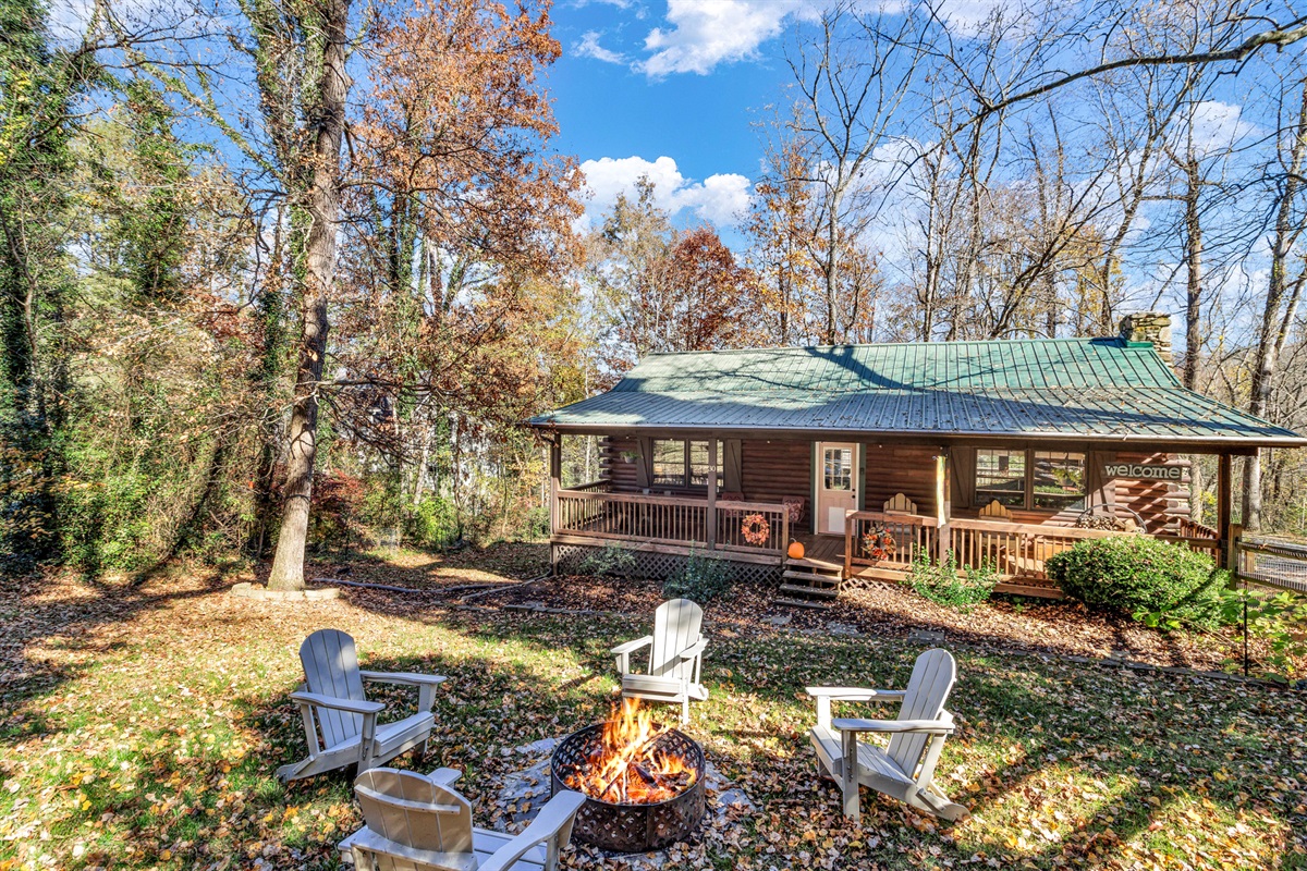 Step onto the spacious front porch, where Adirondack chairs and a full dining table invite you to sip coffee at sunrise or share a candlelit dinner under the stars. Inside, you’ll find a warm and welcoming living space with plush seating, a Roku TV, and a small workspace for those moments when you need to check in with the world—before returning to mountain serenity.